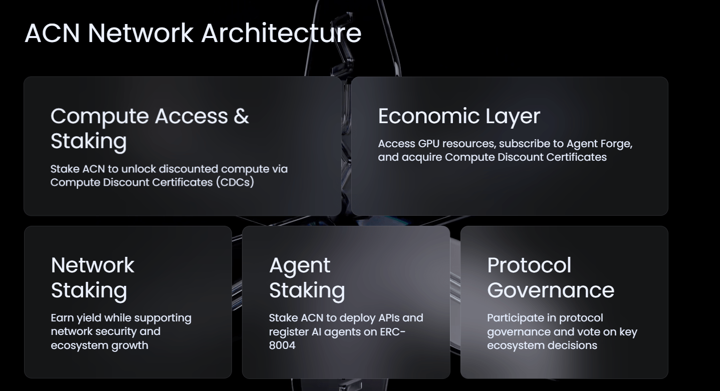 - Economic Layer: Tüm ekosistemi $ACN token’ı üzerinden birleştirir. Platformda gerçekleşen gerçek kullanım (compute + agent execution), doğrudan token ekonomisini destekler.