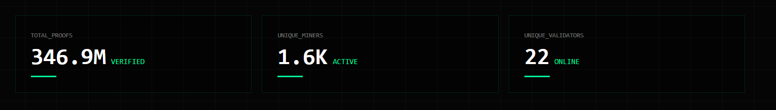 Ağın bugüne kadar başarıyla doğruladığı toplam 346,9M proof, kullanım yoğunluğunu gösteriyor; 1,6K aktif miner ağın merkeziyetsizliğini desteklerken, 22 online validator ise doğrulama sürecini denetliyor.