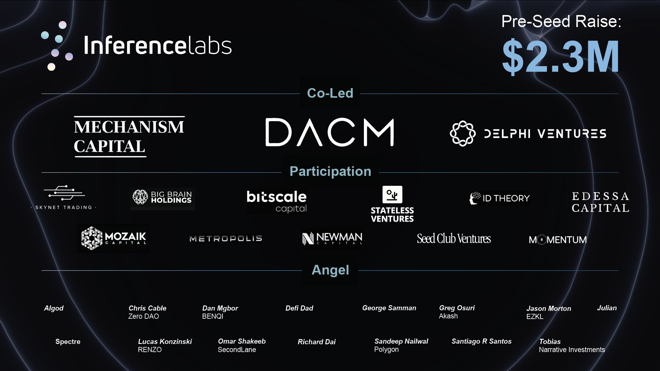 Inference Labs, bugüne kadar 2,3 milyon dolar yatırım alarak sektördeki rüştünü ispatladı. Delphi Ventures, Digital Asset Capital Management (DACM) ve Mechanism Capital gibi devlerin liderlik ettiği yatırım turlarına, Big Brain Holdings ve BitScale Capital gibi önemli isimler eşlik etti.