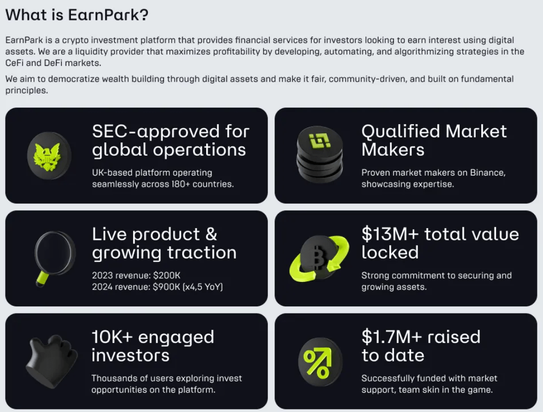 2017’den beri geliştirilen delta-neutral algoritmik stratejileri temel alan EarnPark, karmaşık yatırım süreçlerini basit bir kullanıcı deneyimine dönüştürmeyi hedefler. Vizyonu, bireysel yatırımcıların şeffaf ve sürdürülebilir şekilde servet biriktirmesine olanak sağlamaktır.