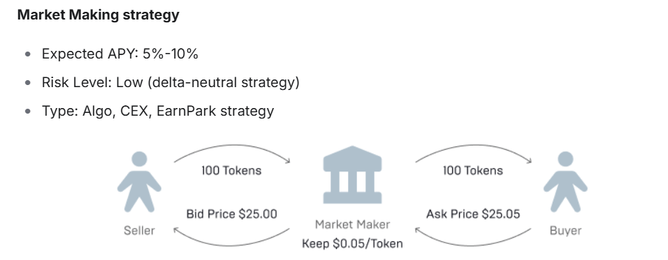 • Market Making: Merkezi borsalarda likidite sağlayarak spread (alım-satım farkı) geliri üretir. Genellikle %5–10 APY hedefli, düşük riskli ve “delta-neutral” bir stratejidir. (Örneğin: Alıcı ve satıcı arasındaki küçük fiyat farklarından düzenli gelir elde edilir.)