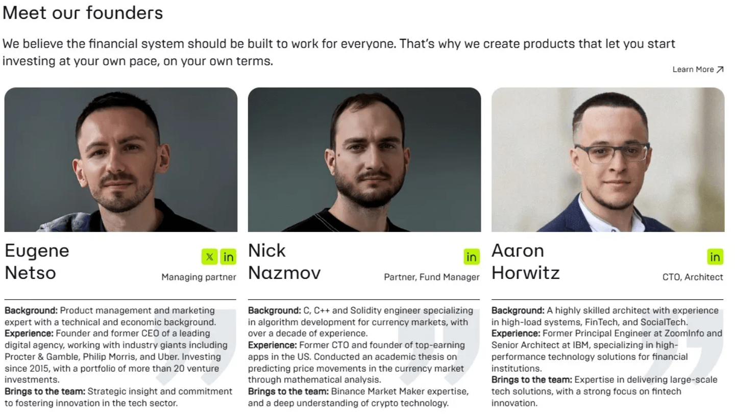 • Nick Nazmov (Fund Manager & Kurucu Ortak): Binance Qualified Market Maker unvanına sahip, 15 milyar doları aşan işlem hacmiyle algoritmik trading uzmanı.
