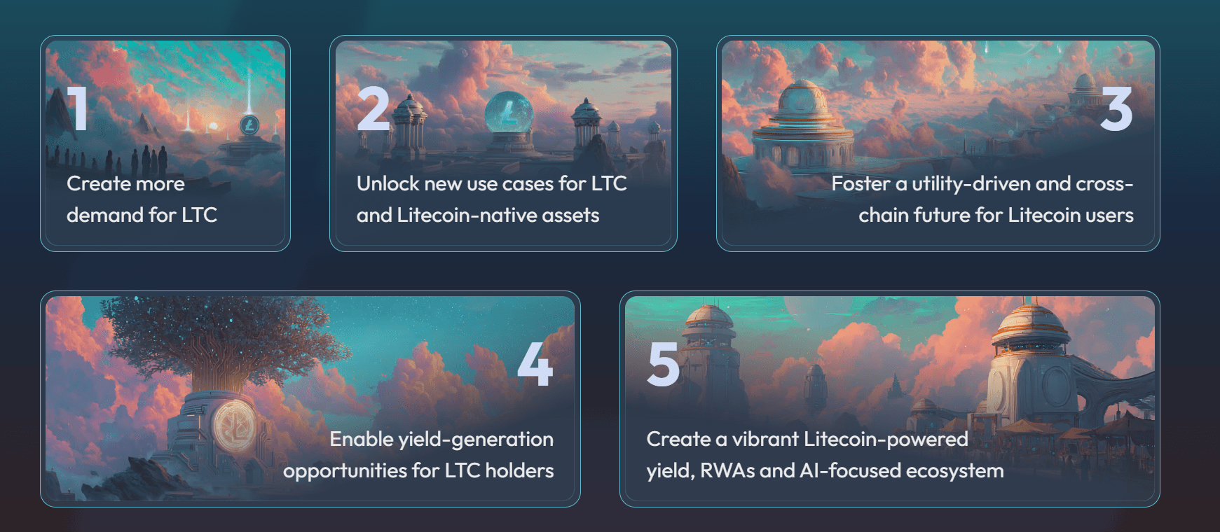 Litecoin PoW güvenliğinin korunması, EVM uyumlu DeFi dünyası, AI ve RWA entegrasyonu, staking ile pasif gelir modelleri.